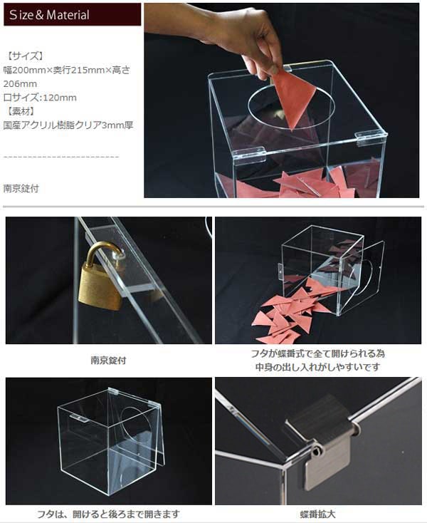 フタ式アクリル抽選箱クリアS/鍵付/W20cm/D21.5cm/H20.6cm
