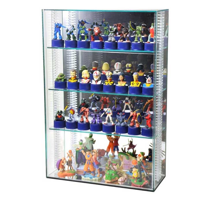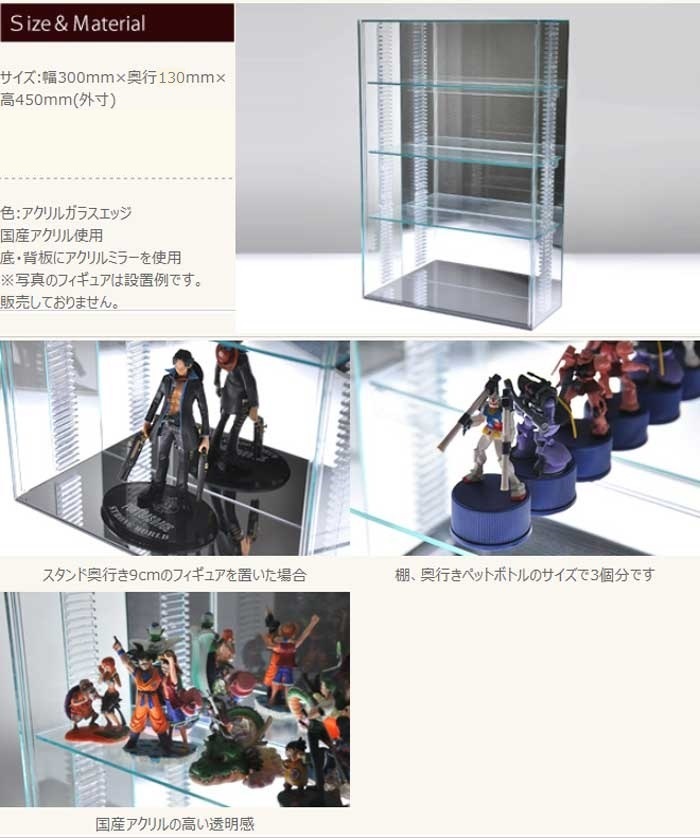 こちらのケースを購入させてもらいました。 丁寧に梱包されていて高さも調節できるので満足しています。 ガラスエッジで高級感もあり良い買い物をしました。台座のサイズにもよりますがアクリルスタンド3列位飾れて収納力もあります。またケースを買う際はこちらで購入します。