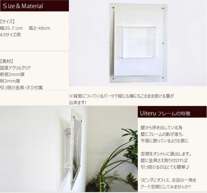 《A3用》壁から3cm浮き出る♪取付簡単アクリルポスターフレーム/ポスターパネル