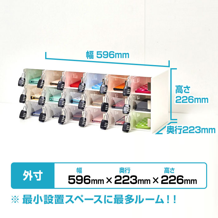 貴重品・スマホロッカー18人用・回しやすいダイヤル錠付・各室コード穴付・ステンレス蝶番・防犯ワイヤー用穴付・割れない透明フタ使用(在庫品)割れない白フタに変更可(+5日)※ご注文の際、備考欄にご記入ください。他全ていつまでも美しいアクリル製
