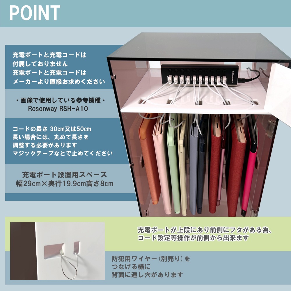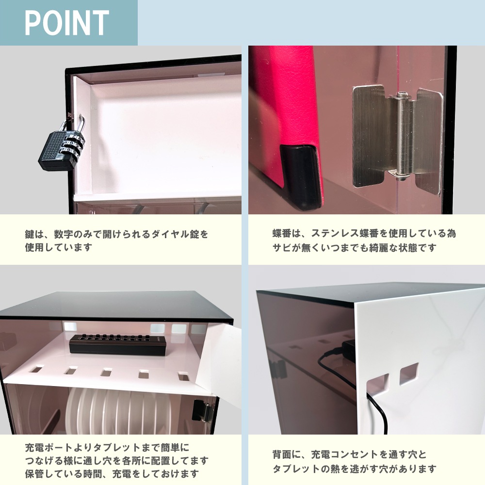 上部で充電ポートを設置出来、充電ポート・タブレット設置個所共にダイヤル錠で管理が出来ます。