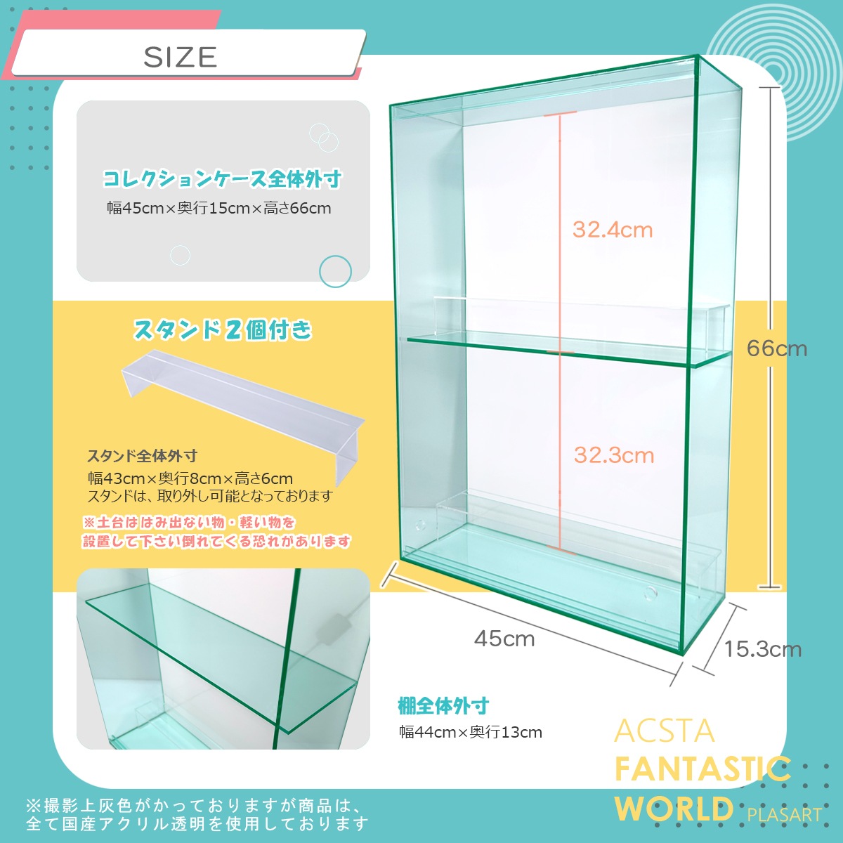 外寸サイズ:幅45cm 奥行:15.3cm 高さ:66cm 国産アクリルガラス色・国産アクリル白・国産アクリルクリア